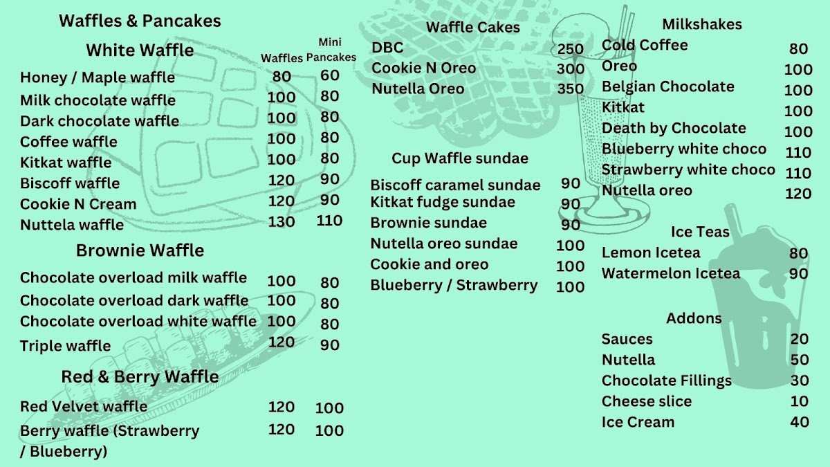 - Waffle Cakes: Delight in the rich flavors of Death By Chocolate and the unique Nutella Orea for ₹250 and ₹350, respectively.